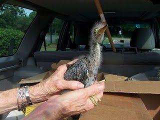 One of the baby green herons fell out of the nest on Friday!!! DRAMA! ANGST! WORRY! The poor mother and father green heron were flying all over talking but he/she was in the ground level bushes and there was no way I could get him/ her back up to the nest. I called around and found the most amazing person- her mission in life is to