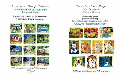 Looking for a great way to add flair to your correspondence? Look no further! The new Mermaid Cottages and Beach Bum Biscuit note card collections are sure to keep Tybee in your mind, no matter where you are! Whimsical and wonderful artwork from Fifi Flowers features our fabulous cottages in one collection, and precious pups in the other. These cards are a great way to put a special touch to your next letter or thank-you note. You could even frame them! They make great souvenirs or gifts, too. Both collections are available for just $24 each. No matter which collection you choose, you’re helping a great cause…proceeds from our Mermaid Cottages note cards help support sea turtles while proceeds from the Beach Bum Biscuit note cards support service and guide dogs.