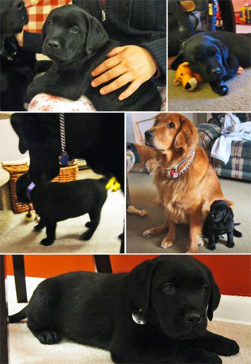 Sandy tells us Knight seems to be a very sweet and calm puppy so far. He really enjoys the company of his new friends, Aldo and Tony. Aldo (on the left above) is also a guide dog, and Tony (on the right) is Sandy’s big, beautiful Golden Retriever. Tony is about 105 lbs. to Knight’s about ten, so we ought to really be able to watch Knight’s growth when he sits next to Tony! Cuteness overload!